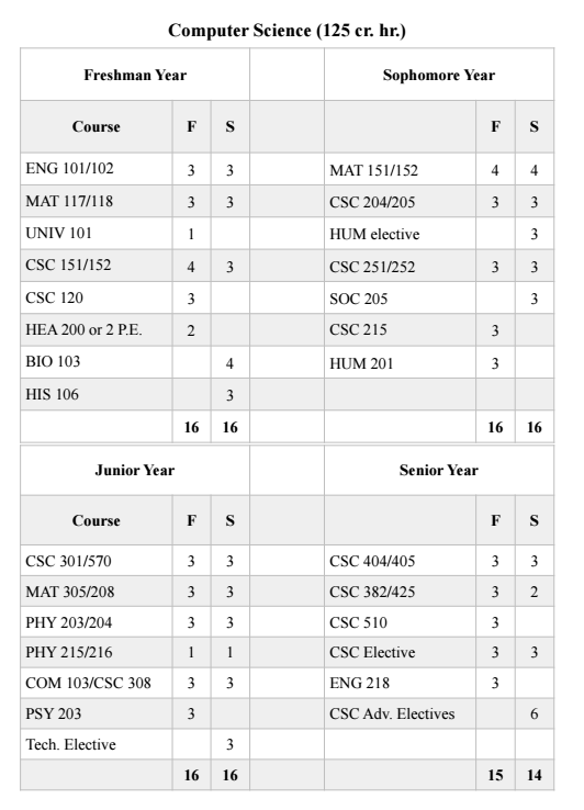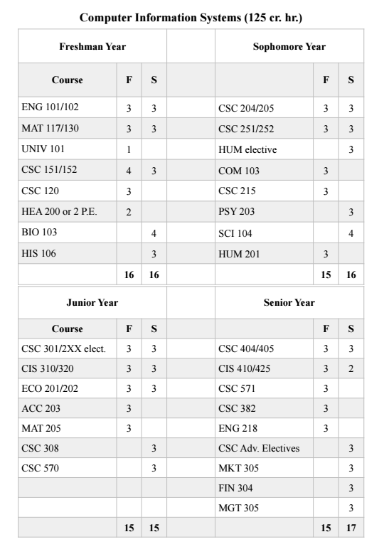 These tables show the curriculum for Computer Science and Computer Information Systems.